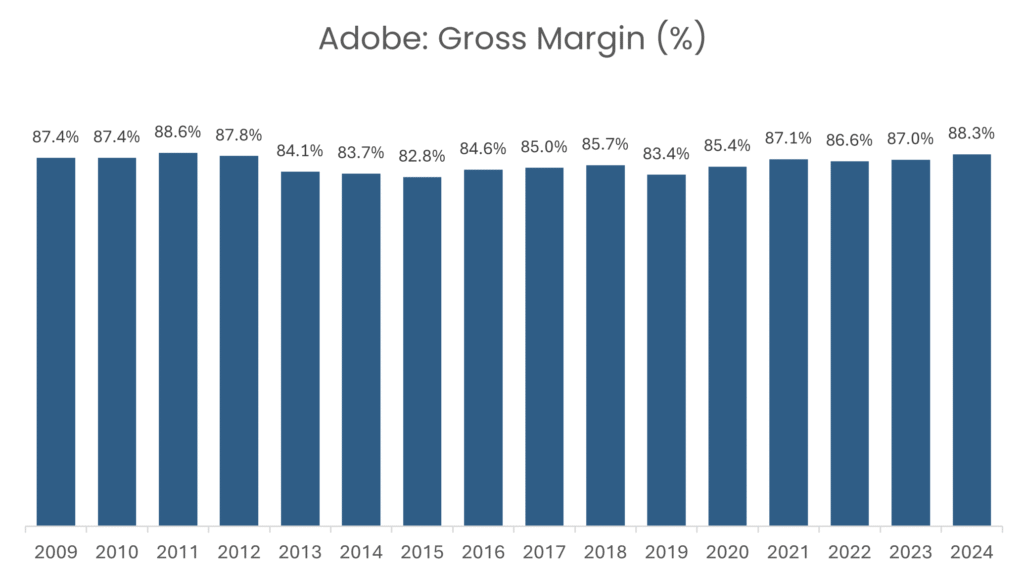Autodesk is a great example. Its industry-standard design software is mission-critical — projects often can’t be completed without it, giving Autodesk strong pricing power. Gross margins dipped between 2015 and 2017 as the company transitioned from one-off license sales to a recurring subscription model. While this temporarily reduced margins, it ultimately strengthened Autodesk’s competitive position, locking in customers. Today, its consistently high gross margins are a clear sign of durable pricing power.