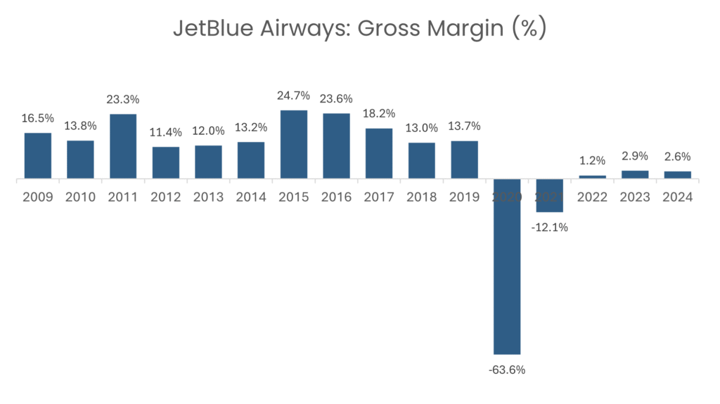 On the other hand, JetBlue Airways’ lack of pricing power stems from intense competition from other airlines, plus consumer price sensitivity, fluctuating operational costs, and regulatory constraints, forcing it to keep prices competitive to retain customers. This is evident from the highly volatile gross margins.